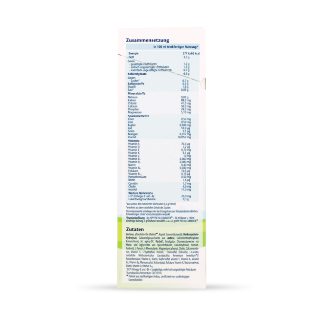 Lactose, Vegetable Oils [Palm Oil, Rapeseed Oil, Sunflower Oil], Whey Protein Hydrolyzate, Galacto-Oligosaccharides From Lactose, Calcium Orthophosphates, Potassium Chloride, LCP from a Mixture of Oils (Vegetable and Fish Oils), Emulsifier (Citric Acid Esters of Mono- and Diglycerides of Fatty Acids), Potassium Hydroxide, Sodium Hydroxide, L-Tyrosine, L-Phenylalanine, Magnesium Carbonate, Choline, Calcium Carbonate, Vitamin C, L-Tryptophan, Inositol, Ferrous lactate, Zinc Sulfate, L-Carnitine, Natural Lactic Acid Culture (Lactobacillus Fermentum Hereditum), Pantothenic Acid, Vitamin A, Niacin, Copper Sulfate, Vitamin E, Vitamin B1, Vitamin B2, Vitamin B6, Manganese Sulfate, Potassium Iodate, Folic Acid, Vitamin K, Sodium Selenate, Biotin, Vitamin D, Vitamin B12.