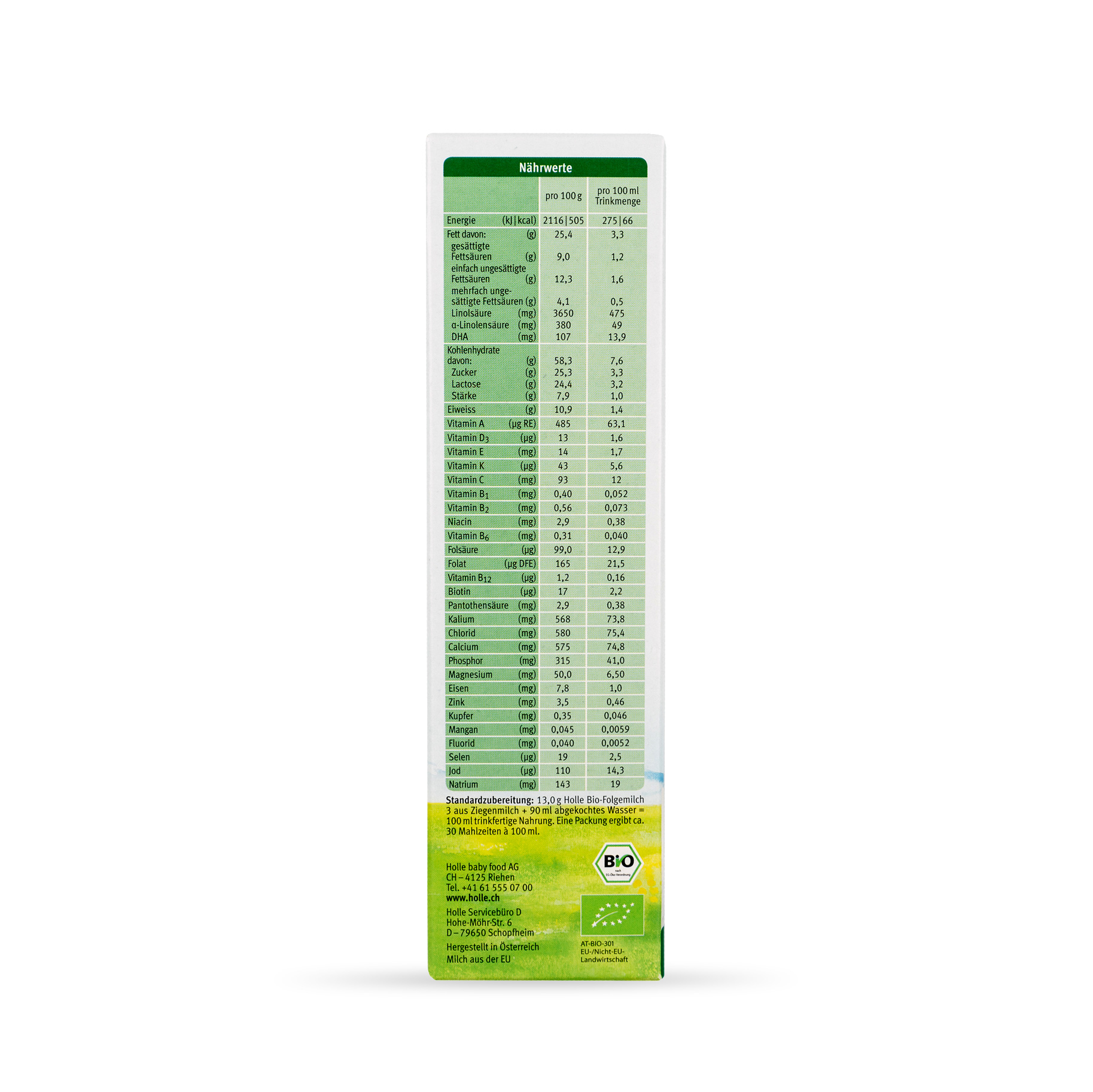 Holle fortifies their goat formulas with three different carbohydrate sources: maltodextrin, lactose, and starch. Adequate carbohydrate content is important for optimal babies’ energy and growth.